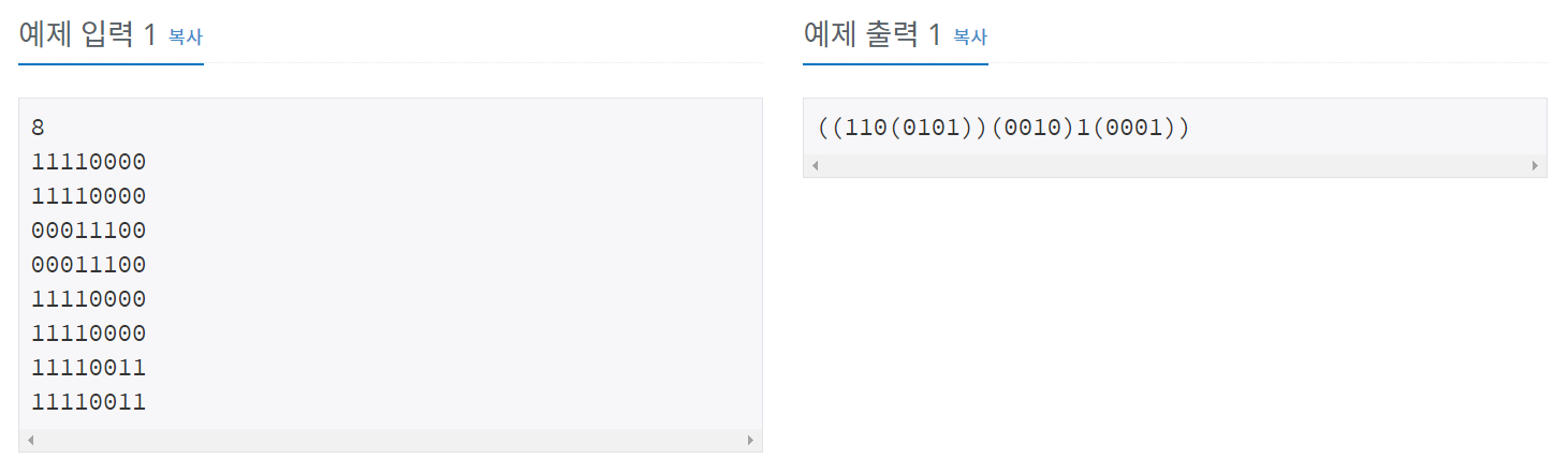 첫째 줄에는 영상의 크기를 나타내는 숫자 N 이 주어진다. N 은 언제나 2의 제곱수로 주어지며, 1≤N ≤64의 범위를 가진다. 두 번째 줄부터는 길이 N 의 문자열이 N 개 들어온다. 각 문자열은 0 또는