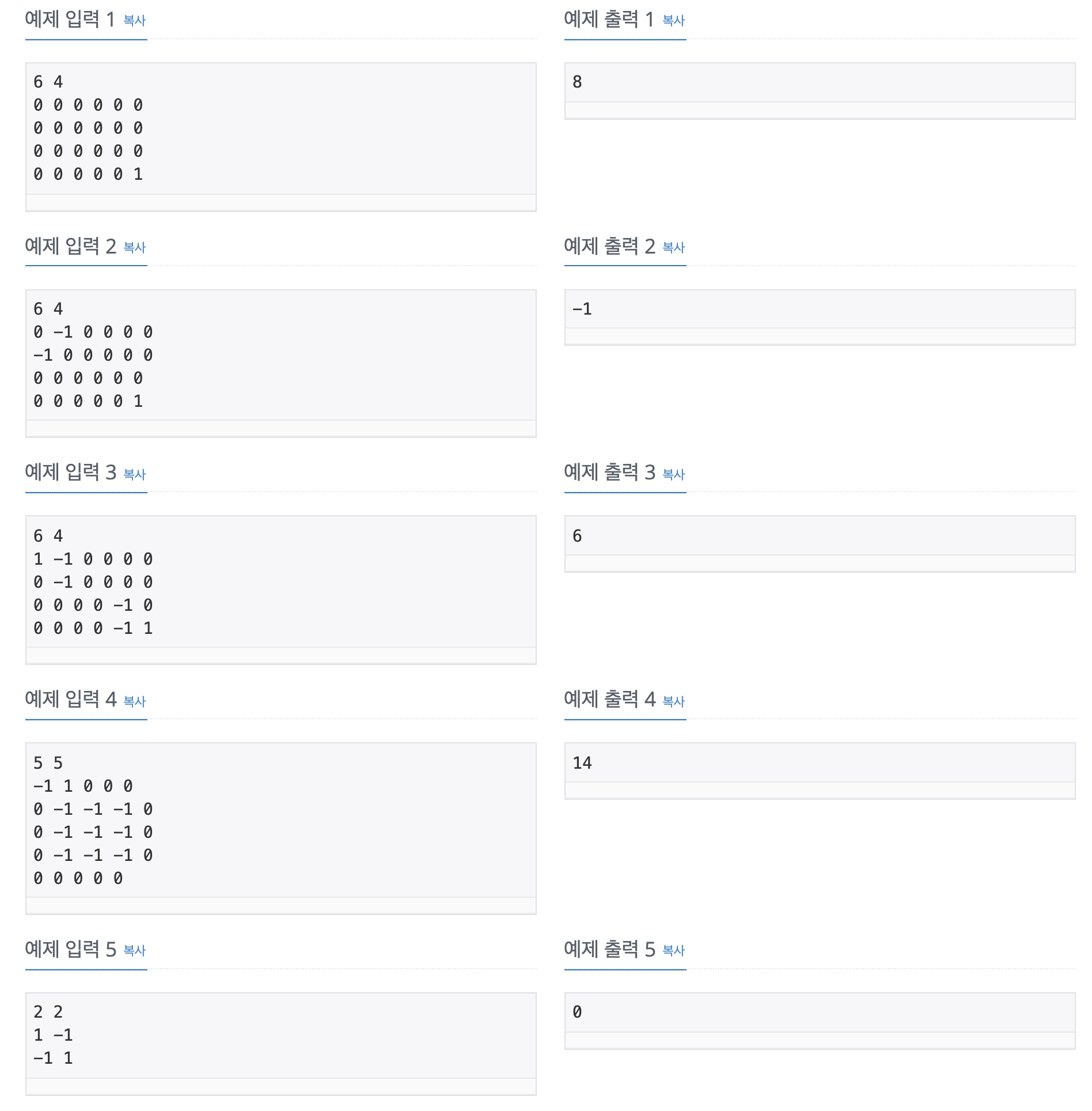 첫 줄에는 상자의 크기를 나타내는 두 정수 M,N이 주어진다. M은 상자의 가로 칸의 수, N은 상자의 세로 칸의 수를 나타낸다. 단, 2 ≤ M,N ≤ 1,000 이다. 둘째 줄부터는 하나의 상자에 저장된 토마토