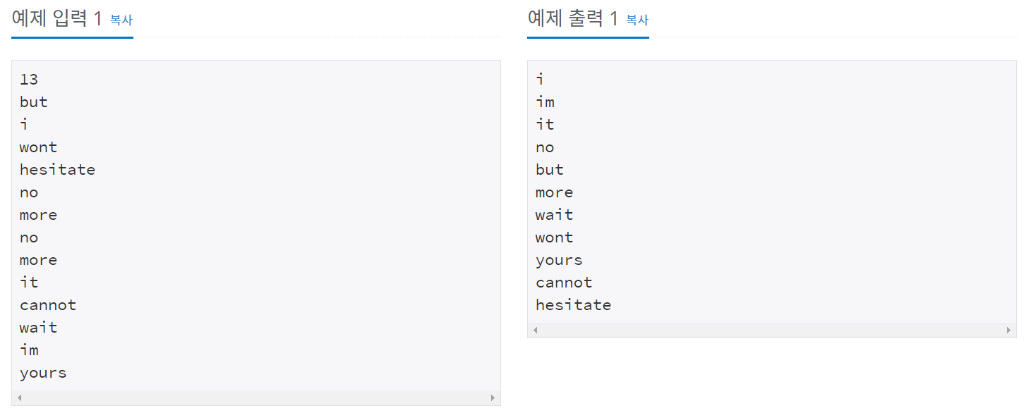 첫째 줄에 단어의 개수 N이 주어진다. (1≤N≤20,000) 둘째 줄부터 N개의 줄에 걸쳐 알파벳 소문자로 이루어진 단어가 한 줄에 하나씩 주어진다. 주어지는 문자열의 길이는 50을 넘지 않는다.